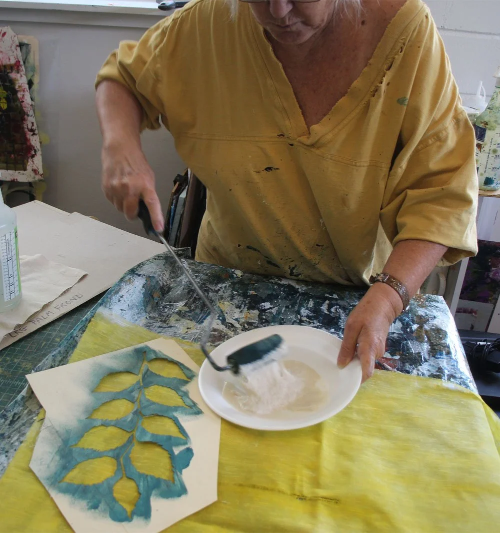 The wheat paste has to dry. Generally overnight is enough. It will be very crunchy and prone to flaking. At this point you can make cracks in it. (I like to push from the back with my fingers or a wooden spoon.) Now, when you overprint, the paint will go randomly into those cracks.