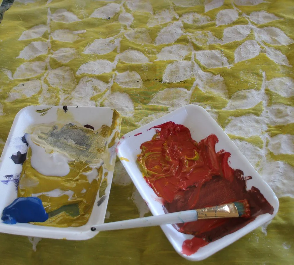 Quick overview: With wheat paste (or any resist material) your goal is to mask out part of the fabric. Cover it up thoroughly. Then paint over the whole surface. Wash out or remove the resist. Then the background shows through in patterns.