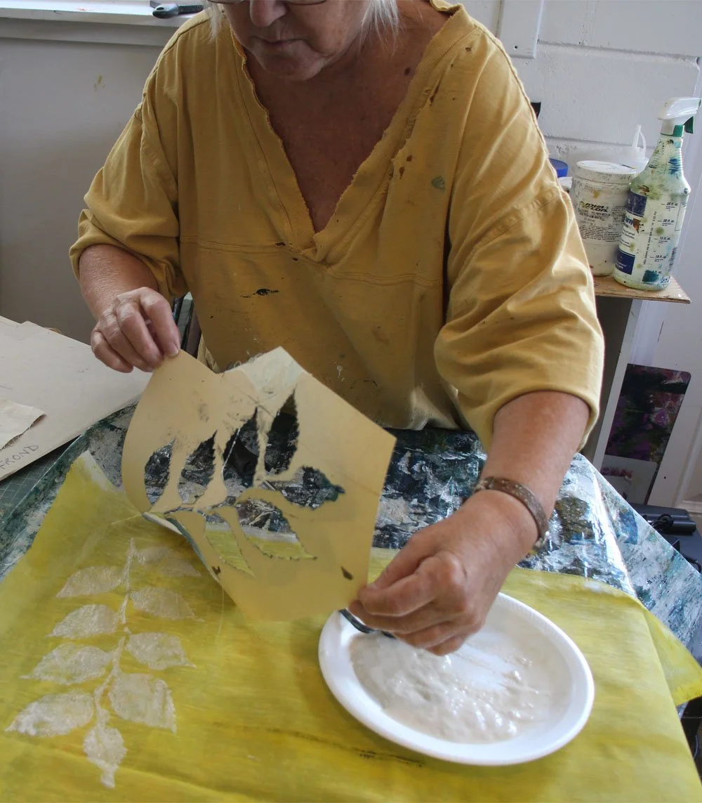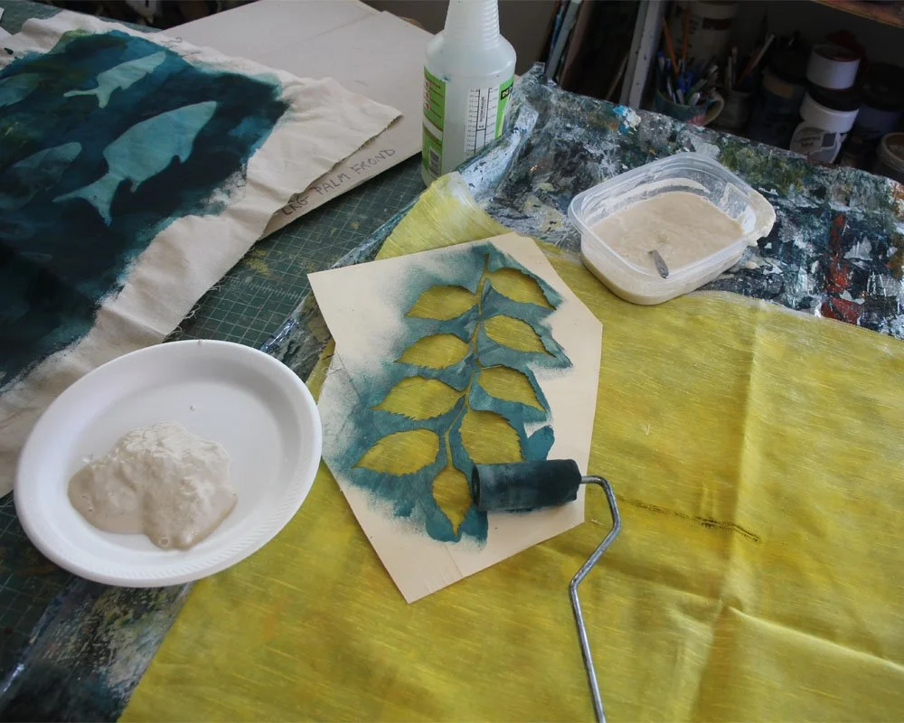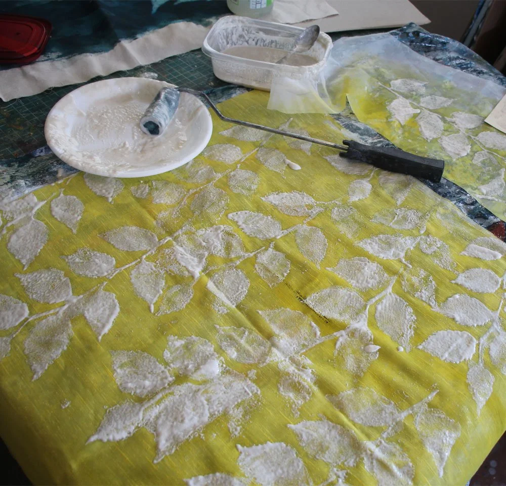 Above, I’m rolling the wheat paste through the stencil. Below, I’ve removed the stencil after the first roll. Then, I moved the stencil over the fabric and repeated the rolling to get a larger area of leaves.