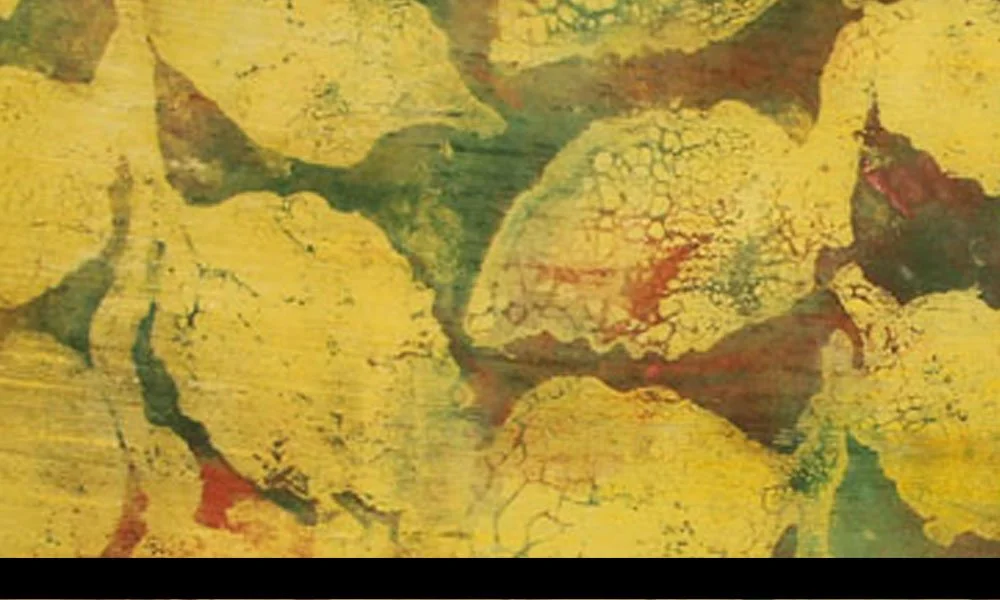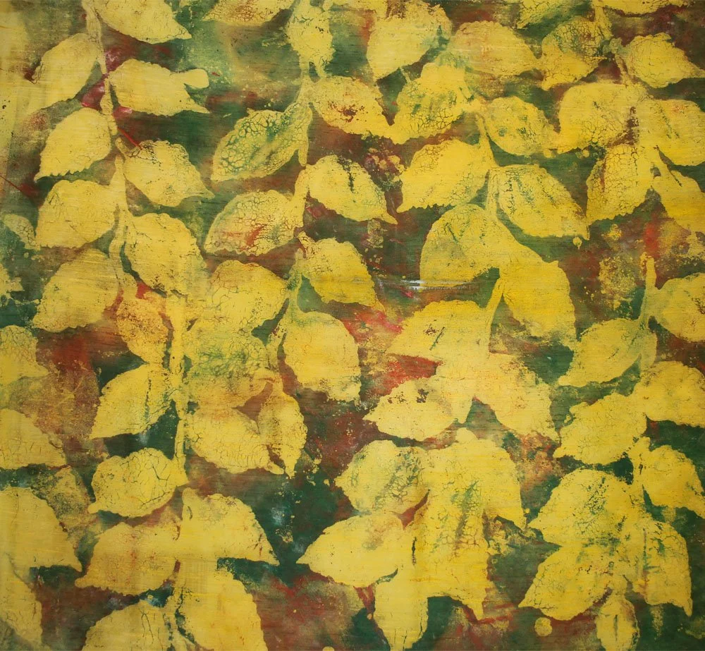 I had some yellow fabric that was gifted to me from an art friend. (It started out white. I painted it yellow.) And I had a panel of printed fish, the remains from a sun printing experiment a few months ago. Tonight I’ll write about the yellow fabric. (Stay tuned for the fish panel next week.)